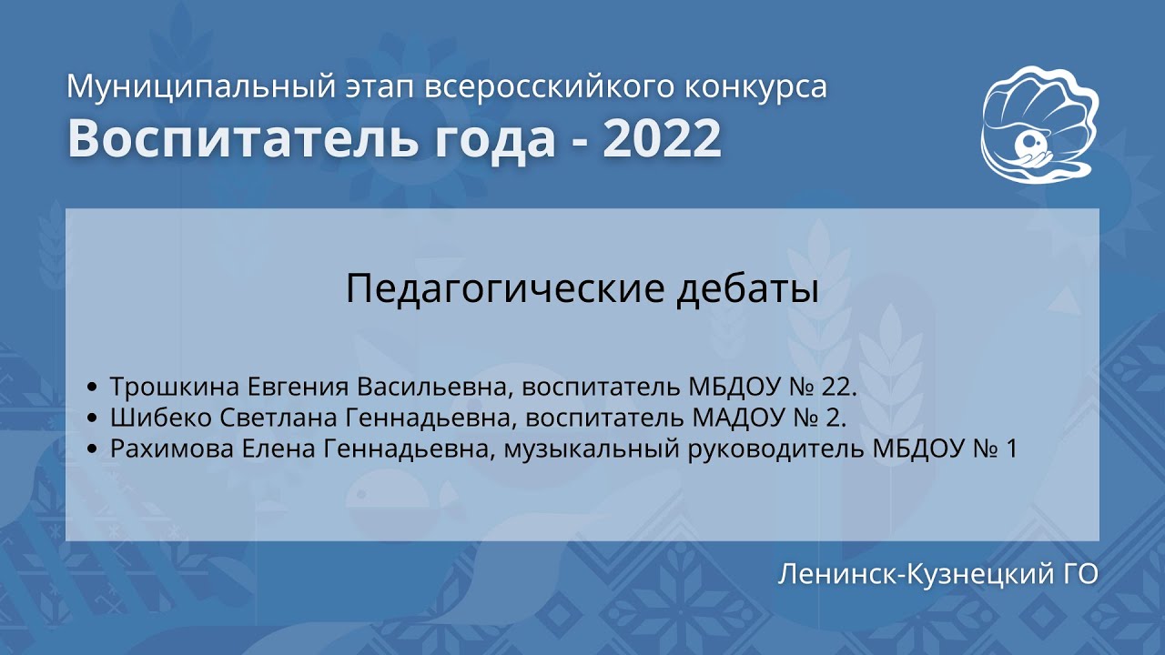 Очный этап включает конкурсные мероприятия: «Моя педагогическая находка», «Педагогическое мероприятие с детьми», «Мастер класс со взрослыми», «Педагогические дебаты». В конкурсе принимают участие 3 педагога из дошкольных образовательных организаций № 1, 2, 22.