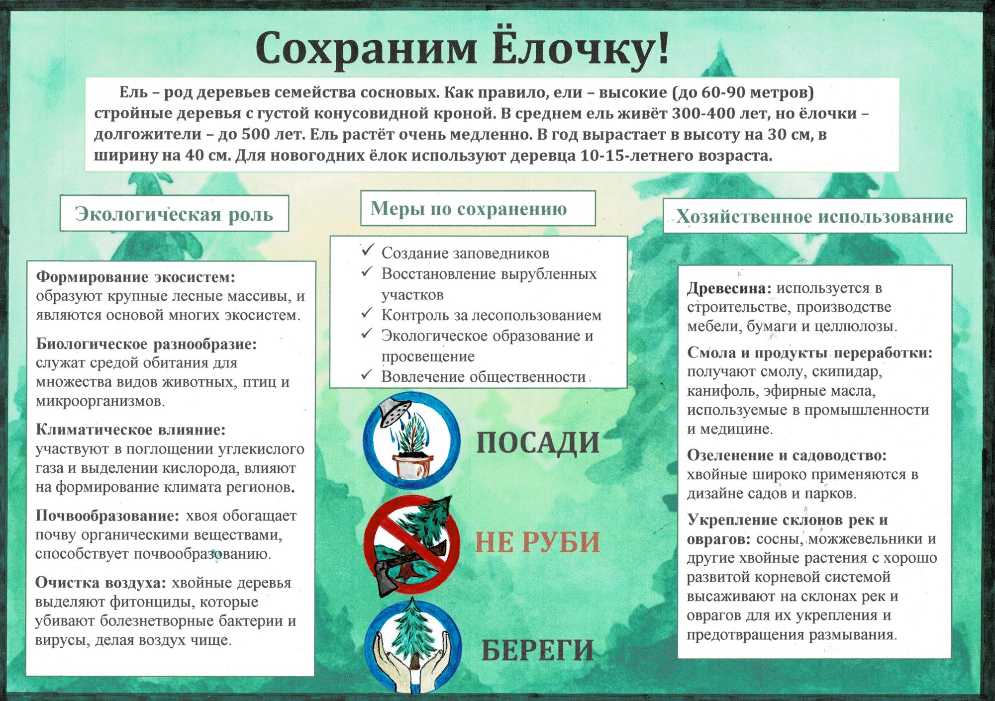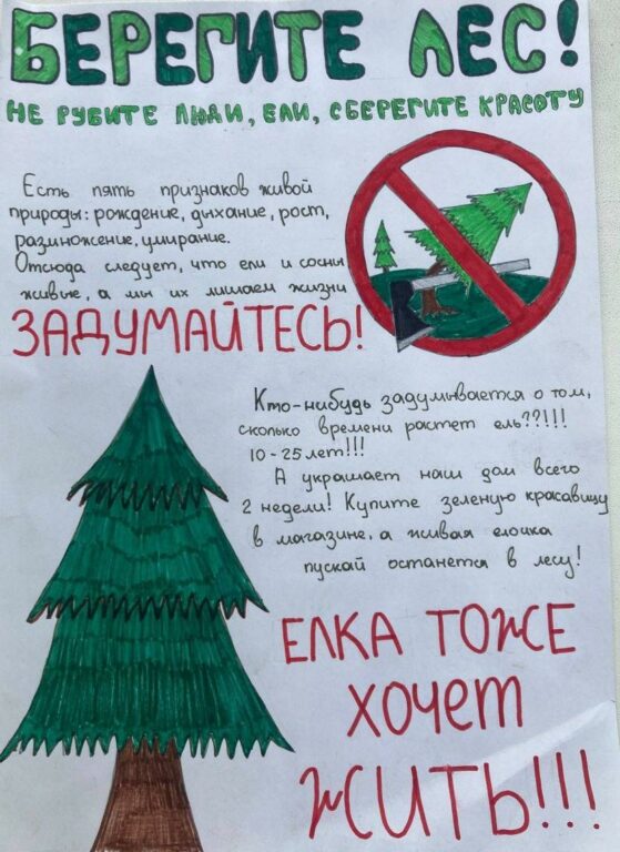 Член школьного лесничества МБОУ «Драченинская ООШ» Барышева Елизавета с эковолонтерами школы и школьный экологический отряд «ЭкоЛайф» МБОУ «Школа № 32» организовали в своих школах акцию «Сохраним елочку!». Они подготовили и вручили жителям близ лежащих домов листовки, рисунки, буклеты с призывом не рубить деревья. На классных часах, экоуроках постарались объяснить детям и родителям вред вырубки хвойных деревьев и важность их сохранения для экологии. Проводили  мастер-классы по созданию альтернативных ёлок из подручных материалов.