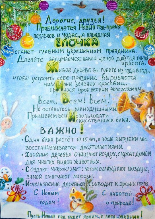 Конкурс проводился с целью привлечения внимания общественности, детей, подростков и их родителей к проблеме несанкционированной вырубки хвойных деревьев в предновогодний период, формирование экологической культуры населения, бережного отношения к природе родного края, развитие творческого потенциала детей